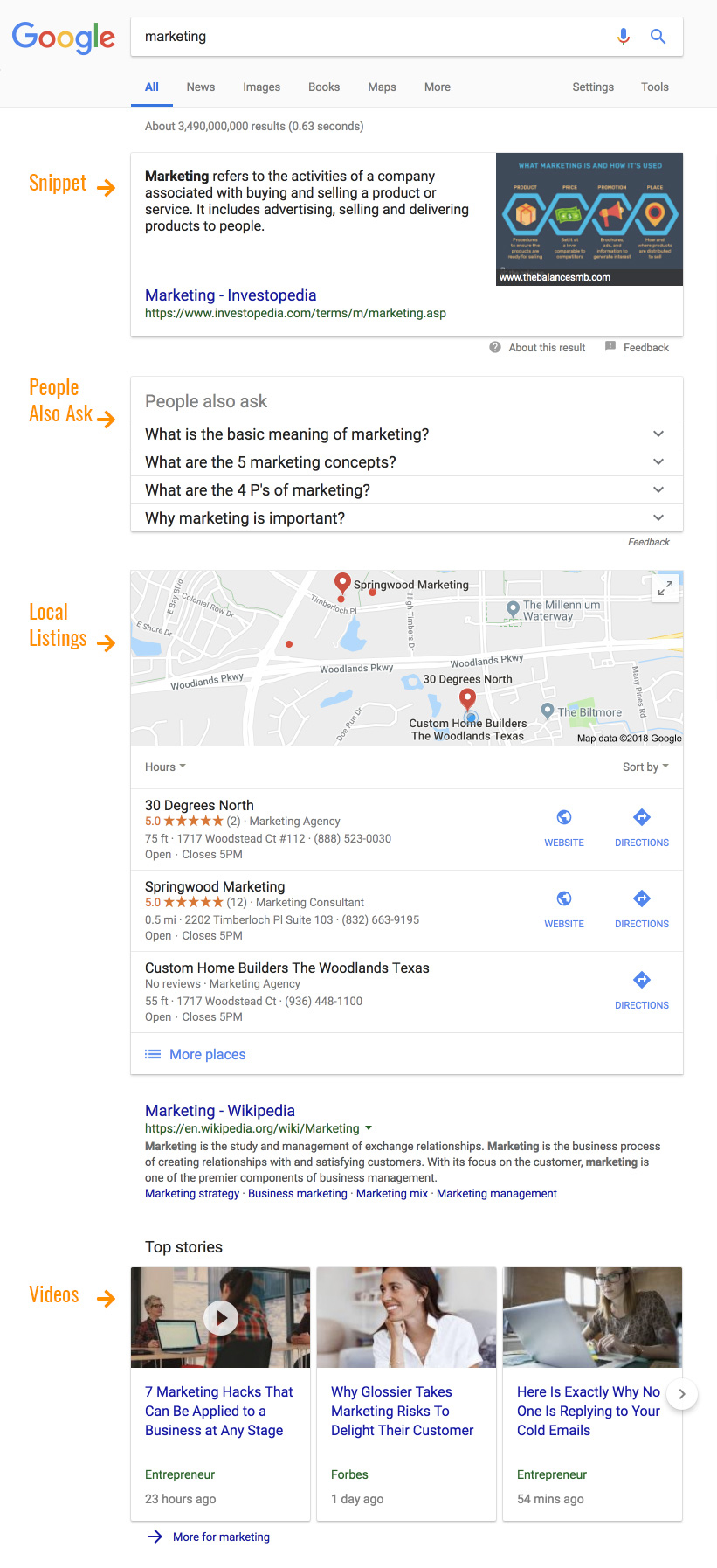 The biggest change is the way the search results pages look. You no longer get a list of ads followed by a list of links with maybe a few map listings in between. Today’s search results are filled with things that Google feels have the potential for providing what you want. It may include one or more of the following in the search results: